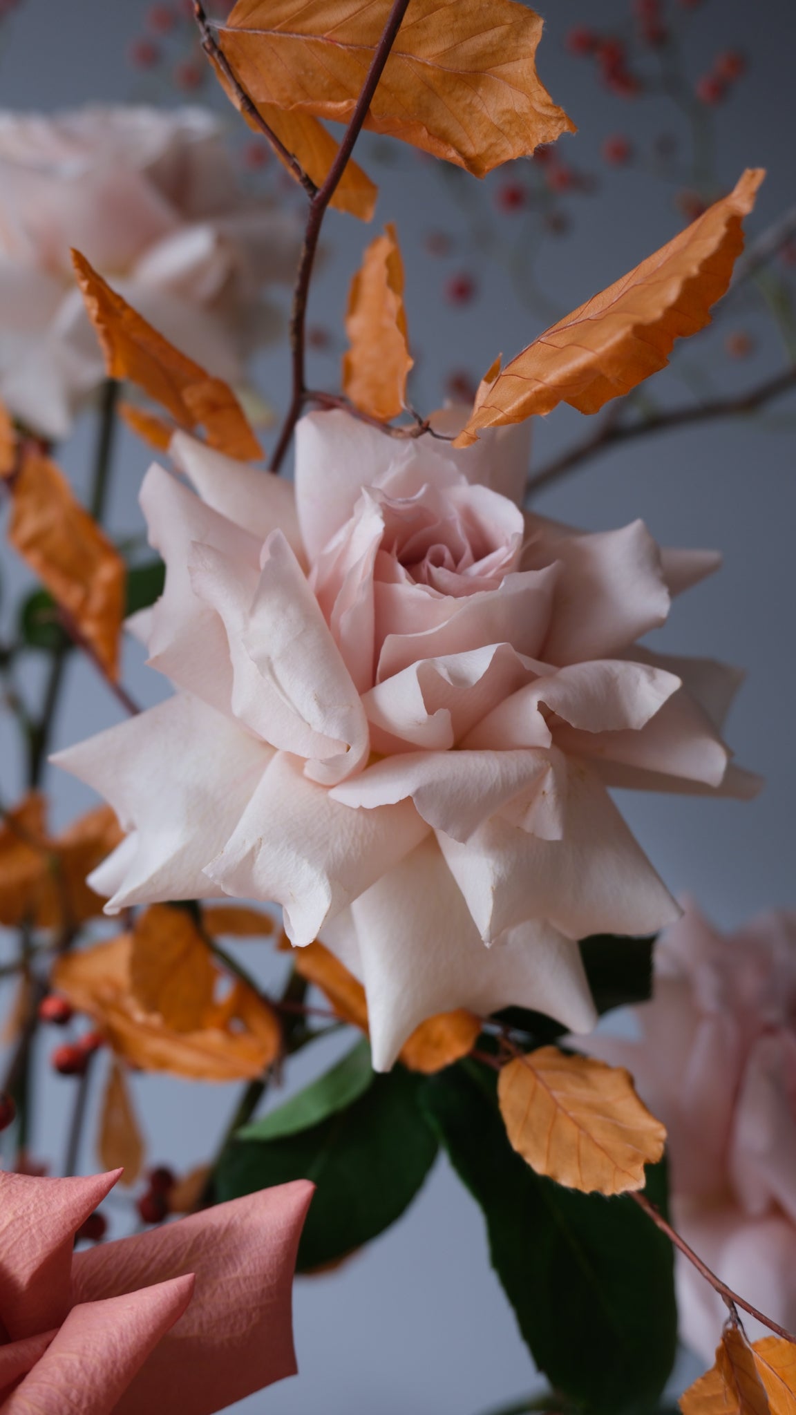 It combines garden roses, chrysanthemums, alliums, scabiosa, hydrangeas, and textured autumn botanicals in a harmonious blend of warm oranges, deep purples, and muted blush tones, accented with berries and fall leaves.