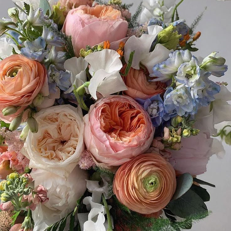 “Cotton Candy” is a dreamy bouquet inspired by the soft play of blush, cream, and rosy tones. The arrangement combines Juliet garden roses, hydrangeas, and spray roses, accented by delicate blue forget-me-nots for a subtle contrast. Light and romantic, it feels like a spring morning captured in flowers — elegant yet effortlessly fresh.