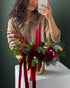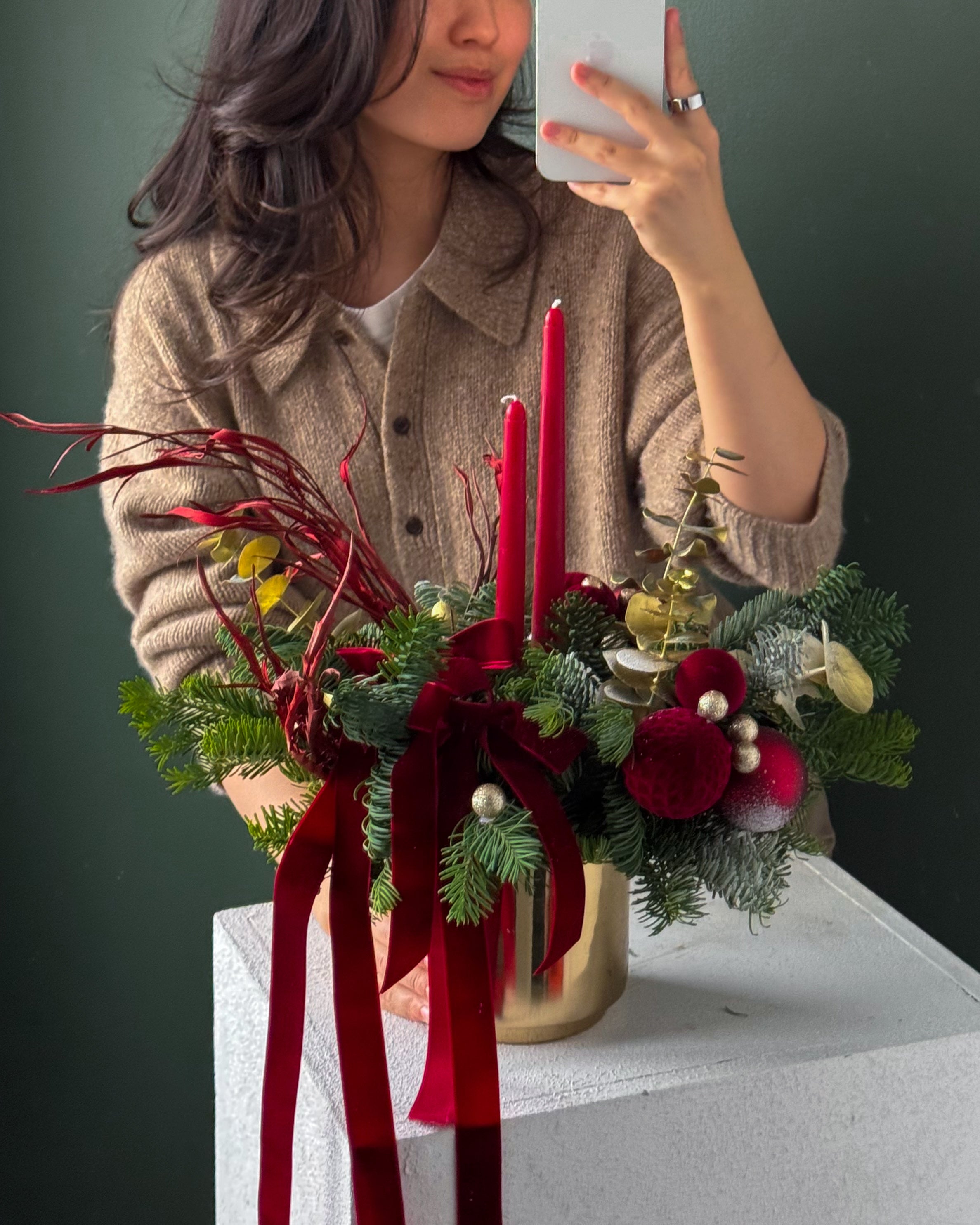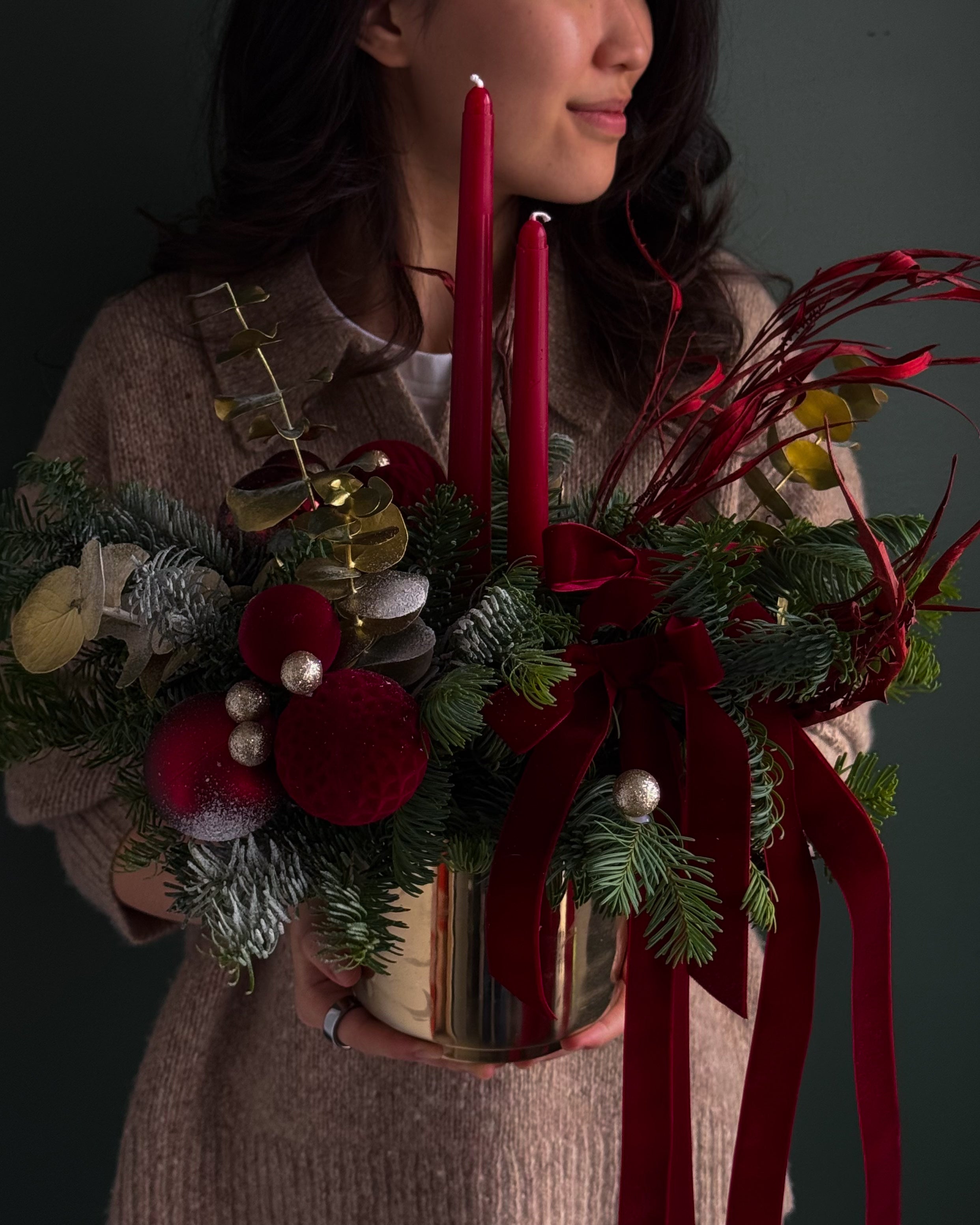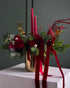 “Rudolph Classic” is a festive Christmas arrangement crafted in rich red tones and lush winter greens. Designed with noble fir, velvet ornaments, frosted accents, eucalyptus, and seasonal textures, it brings an elegant, warm holiday atmosphere to any dining table, mantle, or entryway.
