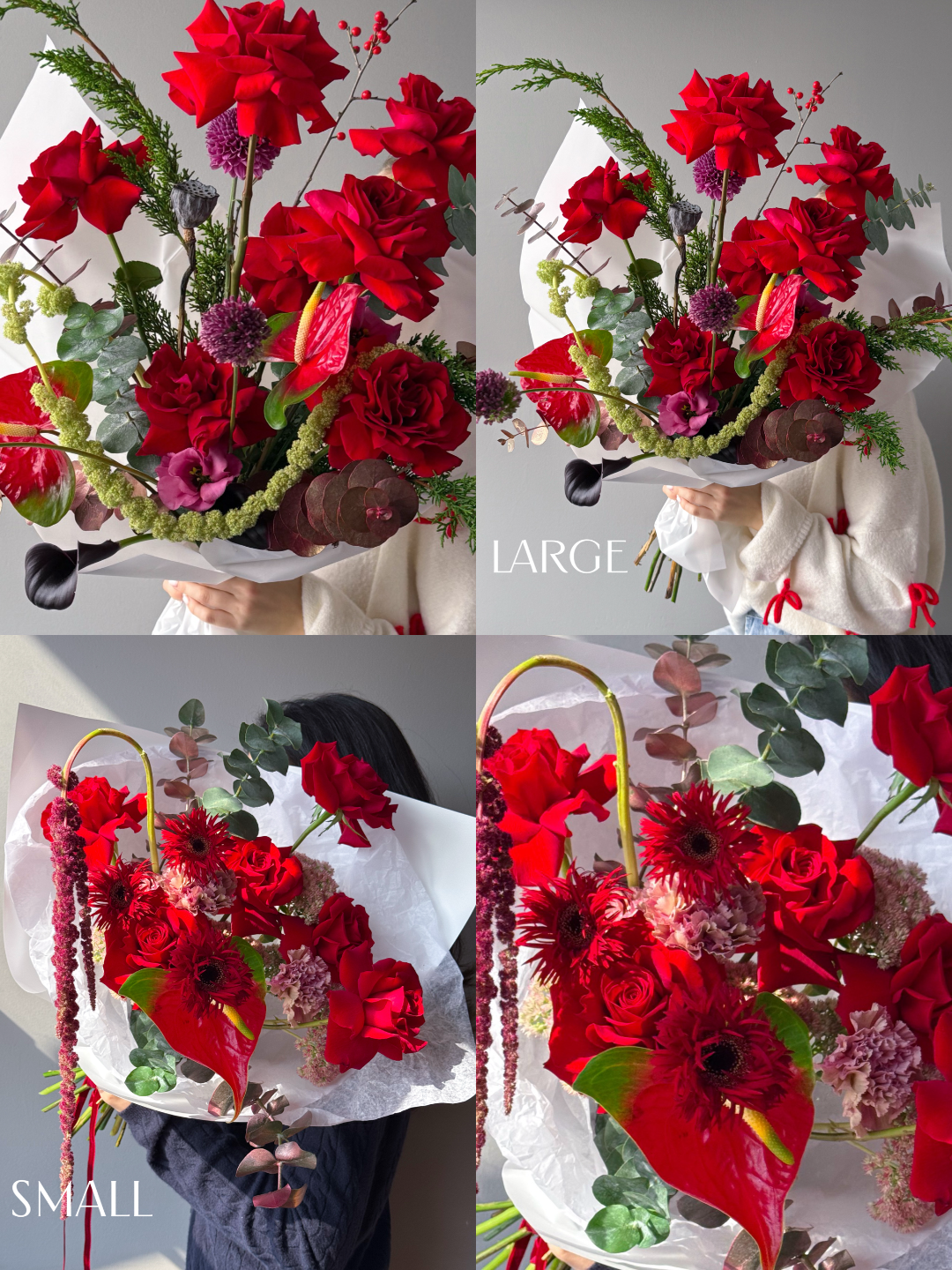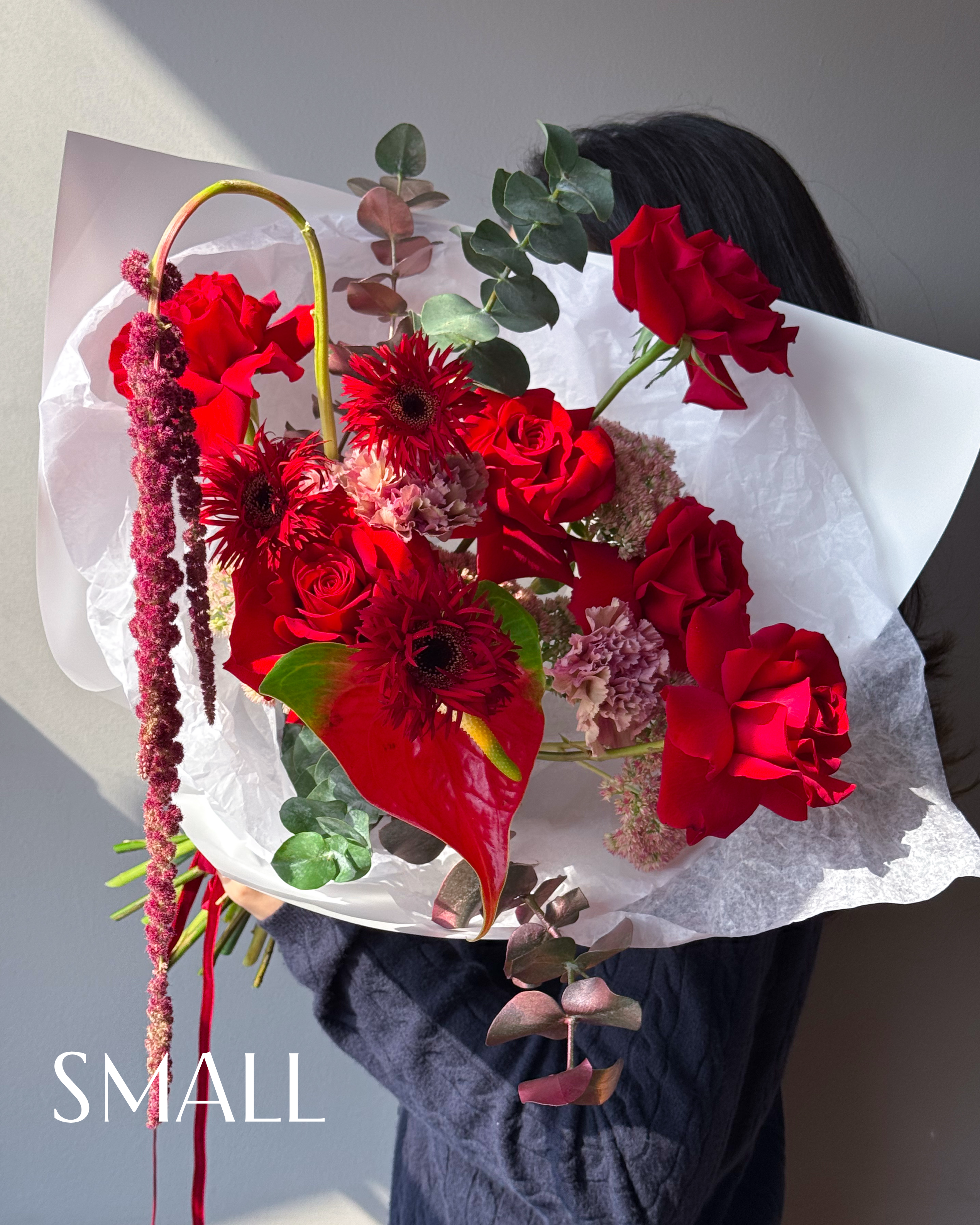 “Ruby” is a bold flow-style bouquet from our Palette Bouquets collection, designed in rich shades of red and deep crimson. Crafted with premium fresh cut flowers, this sculptural hand tied bouquet features striking red roses and anthuriums as focal blooms, complemented by seasonal accents such as red gerberas, amaranthus, and eucalyptus.