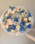 Round Bouquet "Baby Blue" - roses, hydrangeas, seasonal flowers